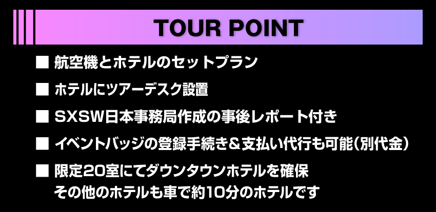 - 本ツアーに関するお問い合わせは弊社「SXSW2026 OFFICIAL ACCESS TOUR」係でのみ承ります。
